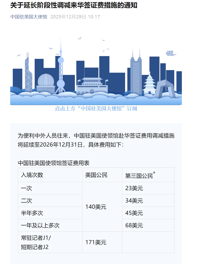 为便利中外人员往来,中国驻美国使领馆赴华签证费用调减措施将延续至2026年12月31日,具体费用如下:
