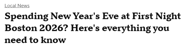 尽管名称是跨年夜,但活动最早于上午10点拉开帷幕,先进行诸多适合全家参与的项目,包括波士顿公共市场(Boston Public Market)的合唱。中午时,波士顿公园(Boston Common)会开设射箭体验课;整个下午,青蛙池塘(Frog Pond)溜冰场还将轮番上演冰上表演秀。