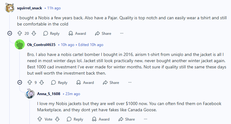 我几年前买了一件 Nobis,家里还有一件 Pajar。质量都非常好,里面就穿一件 T 恤,在寒冷天气里也很舒服。