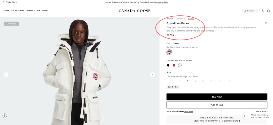 不行了,CG 早就“变味”了,现在主打的是“奢侈品牌”。20 年前我买的时候,确实扎实又值。现在一顶毛线帽卖 250 加元,一件派克大衣 1,795 加元(例如下图,远征款派克大衣,税后 2,028 加元),真下不去手。