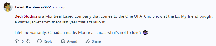 我朋友去年买了他们家的冬季外套,特别棒。终身保修、加拿大制造、蒙特利尔风格……真的没什么可挑的。