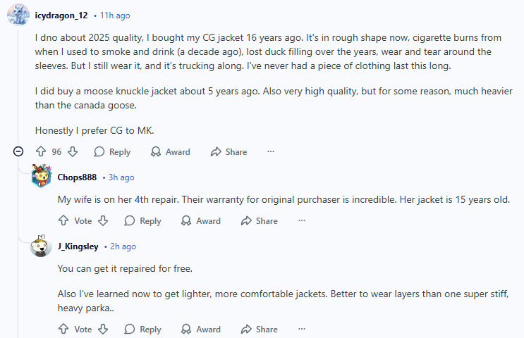 所以现在我有一件 25 年以上的 CG,看起来跟新的一样。说实话,现在好外套品牌很多,也有不少提供终身保修。但选 CG 基本不会踩雷。