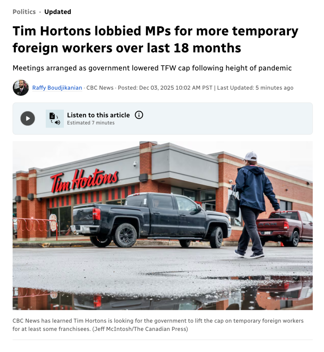 过去一年多来,加拿大咖啡巨头 Tim Hortons 一直在向联邦政府施压,要求放宽其部分加盟店可聘用的临时外籍劳工(TFW)比例上限,CBC News 获悉。这些要求持续了至少 18 个月,以书面形式提交,也包括在游说官员及议员的会议中提出。当时,加拿大民众对移民的观感不断恶化,而渥太华也在减少多项新移民渠道。