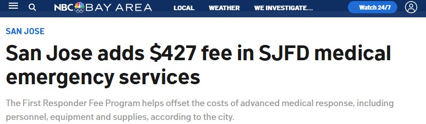 圣荷西市表示,第一响应者费用计划(First Responder Fee Program)旨在帮助抵消高级医疗响应所产生的成本,包括人员、设备和用品等支出。