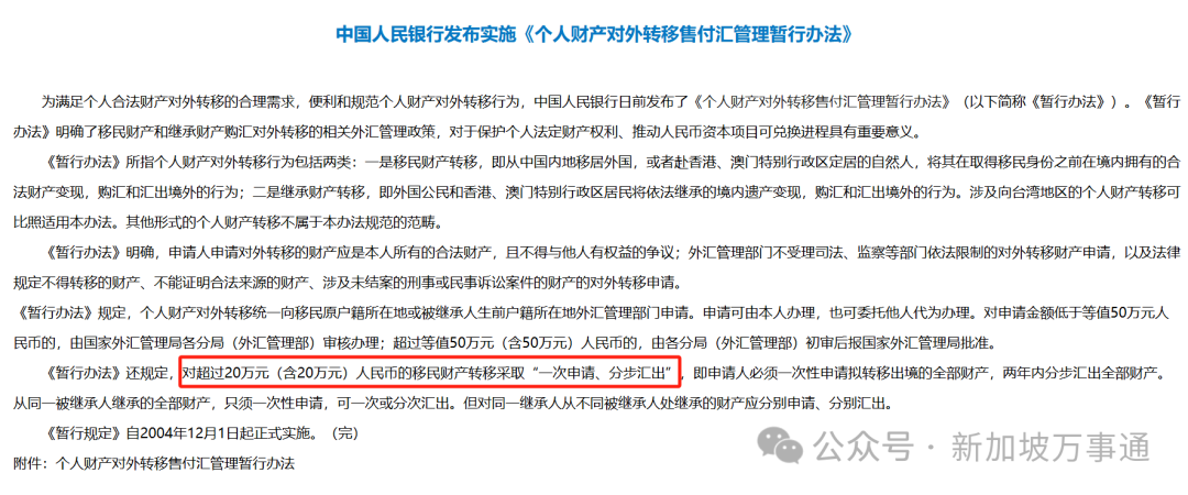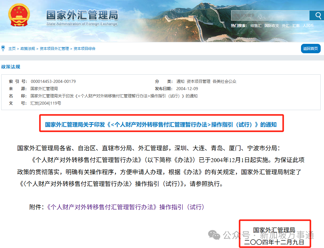 早在2004年,国家外汇管理局就发过一份文件—《<个人财产对外转移售付汇管理暂行办法> 操作指引(试行)》。