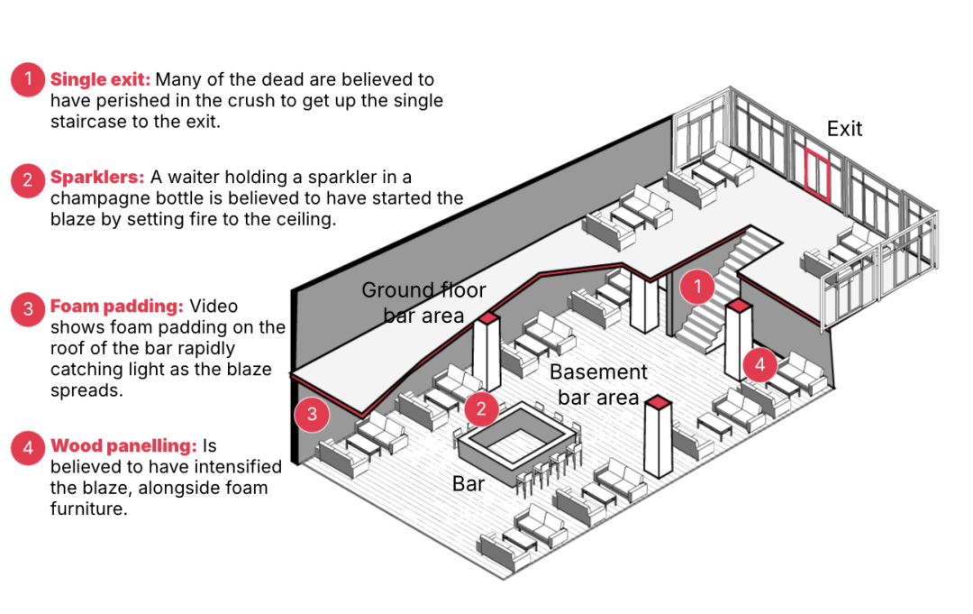 根据瓦莱州消防检查2025年第三季度的报告,Le Constellation酒吧在安全评级满分10分的情况下只得了6.5分。酒吧内部全是木制家具,天花板也是木制,表面覆盖了吸音泡沫,且只有一个狭窄的楼梯可以逃离现场。