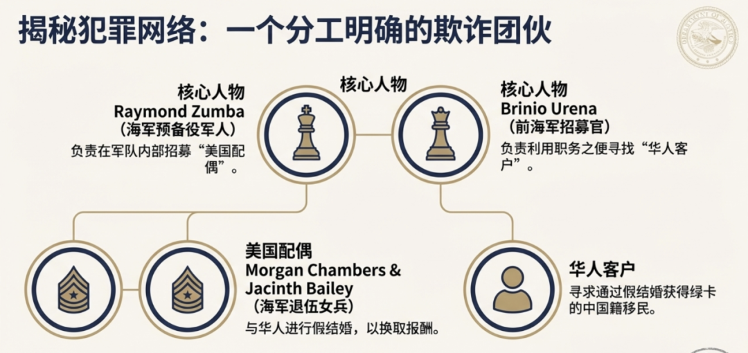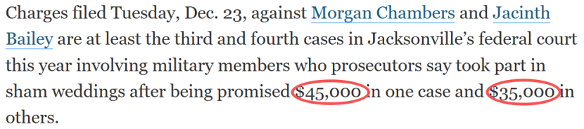 据报道,两名女性海军成员,Morgan Chambers和Jacinth Bailey通过佛州杰克逊维尔的中介,与中国籍移民进行假结婚,以帮助他们获得绿卡。