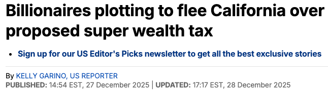 多名亿万富豪正酝酿收拾行囊离开加州,以抗议一项拟通过公投、向州内最富有人群大幅加税的提案。《每日邮报》报道标题