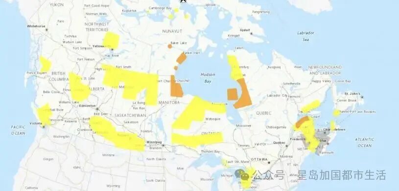 西北地区北Slave地区发出严寒警告,风寒值接近零下50度。努纳武特多个社区则同时受暴风雪、冬季风暴及强风警告影响,能见度或降至近乎零,阵风达每小时80至100公里。