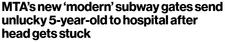 据MTA介绍,这些设计旨在防止乘客逃掉2.90美元的车费。然而,逃票者依然能够轻易绕过该闸机,而其他守规矩的乘客却被这些快速关闭的闸门夹住并受伤。