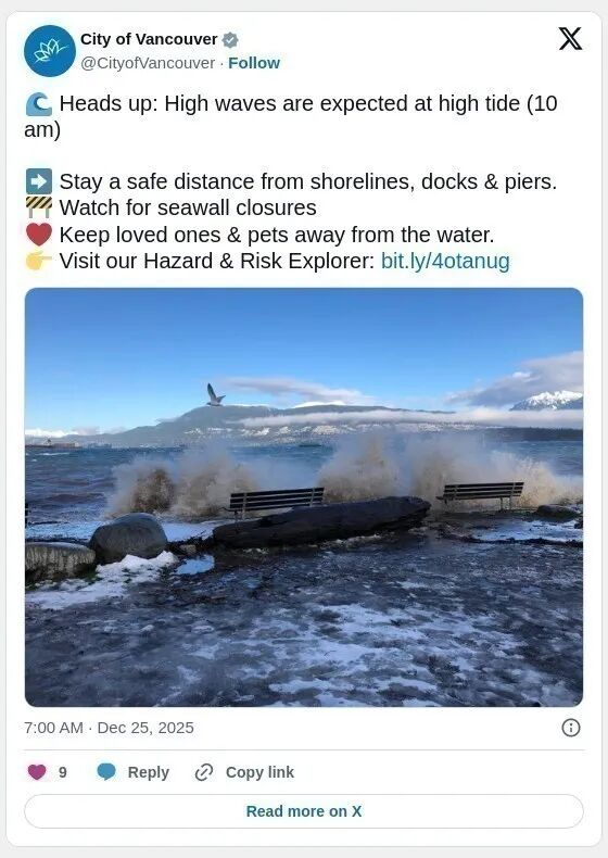 圣诞节的时候,温哥华市府就在提供提醒民众预计涨潮时将会有大浪。