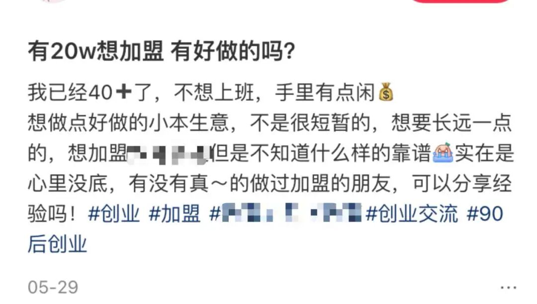 许多想要创业的县城中产之前都没有创过业,算是商业小白,但是手里又有个二三十万闲置资金,渴望找一些几个月就能回本,小白也可以赚大钱的品牌创业。