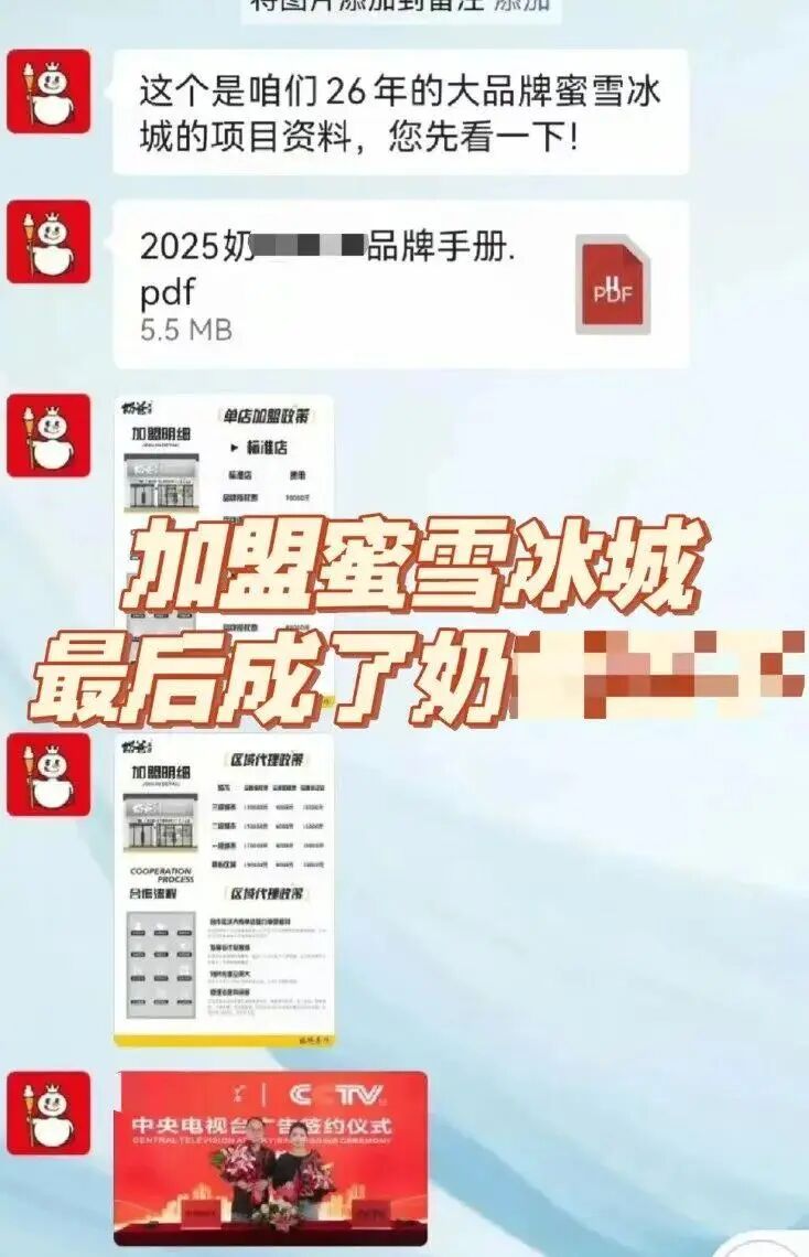 有些人开始是想要找个大品牌加盟,比如说蜜雪冰城,后面通过网络途径联系到了自称是蜜雪的招商人员,对方开始就会以高昂的加盟费让其知难而退。