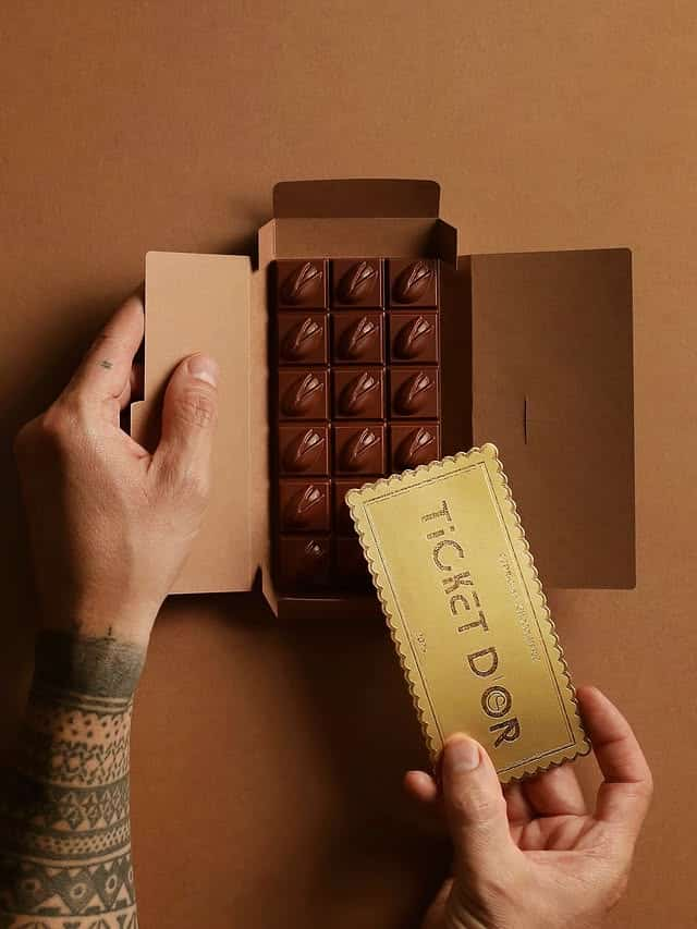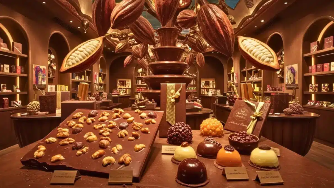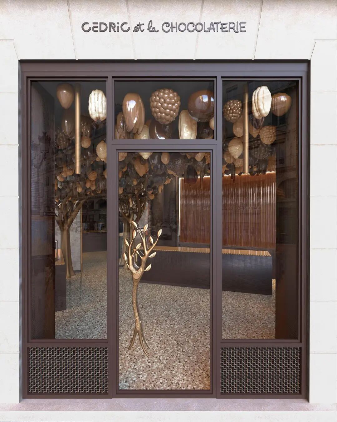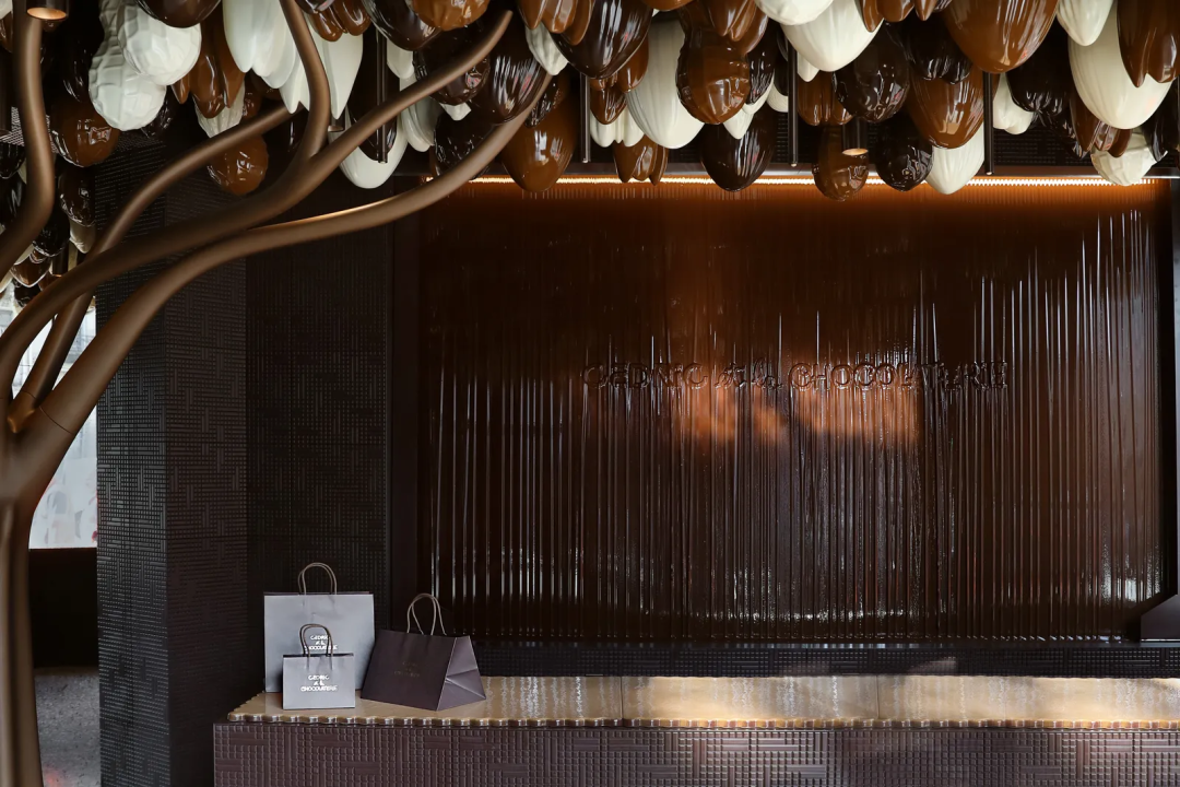 墙上奔涌着巧克力的瀑布,树上垂挂着巨大的坚果与糖果,连柜台都被设计成了一块块巨大的“小饼干”模样。为了开业造势,水果哥甚至复刻了《查理和巧克力工厂》里的经典桥段,在巧克力排里藏了十张“金色奖券”。