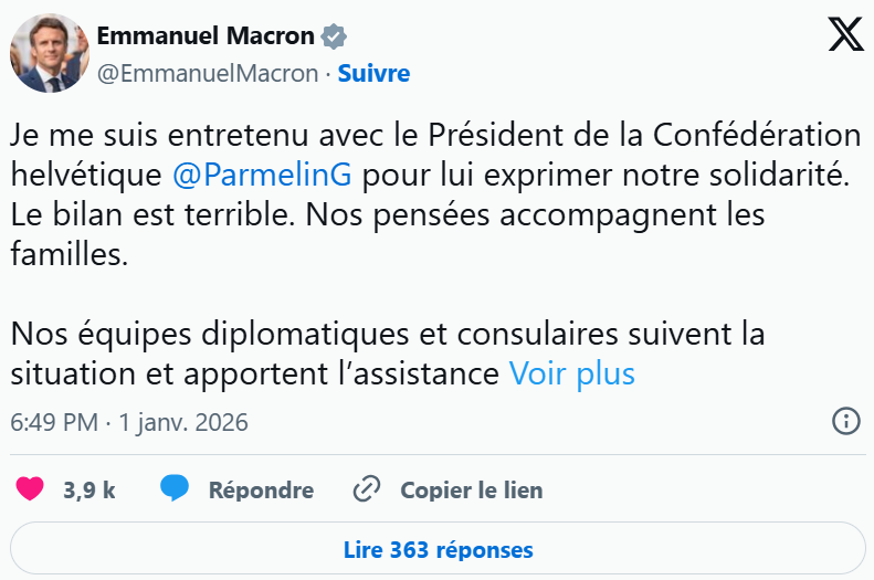 这场灾难的波及面远超瑞士边境。由于多名伤亡者为法国籍(遇难者包括三名凡尔赛高中生),法国总统马克龙在第一时间介入,在平台X上发文。