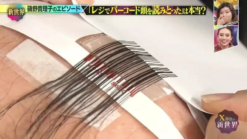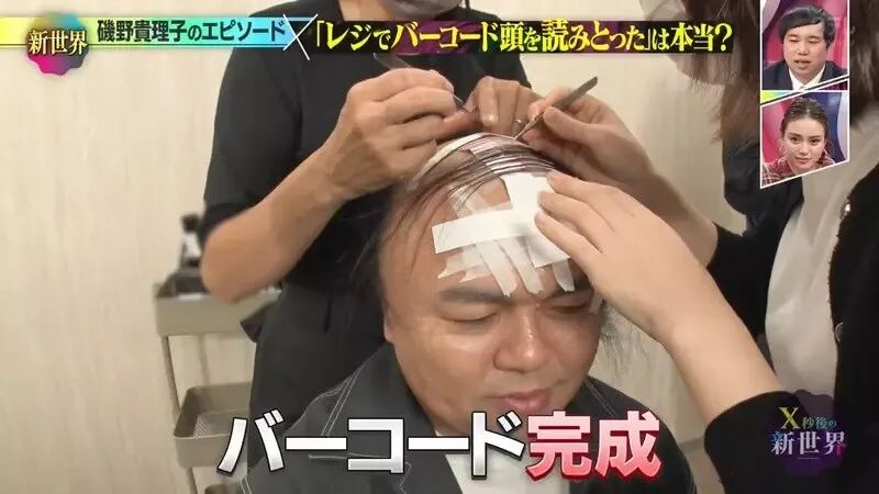 经过两位发型师和化妆师的通力合作,一个逼真的巨大“条码发型”在菊地优志头上呈现出来。