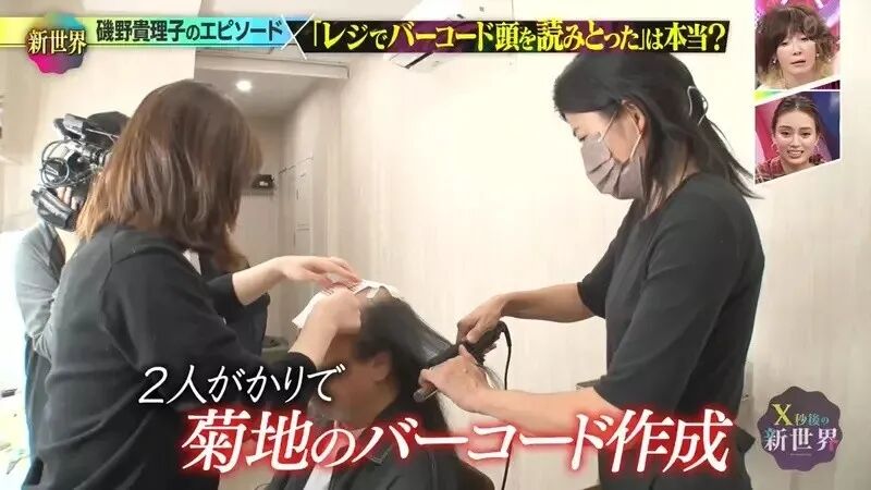 两位艺人分别由发型师协助,一边重现真实条码,一边对头发进行加工。