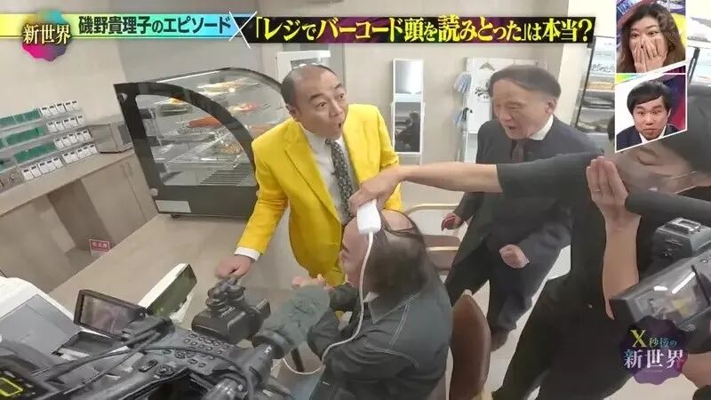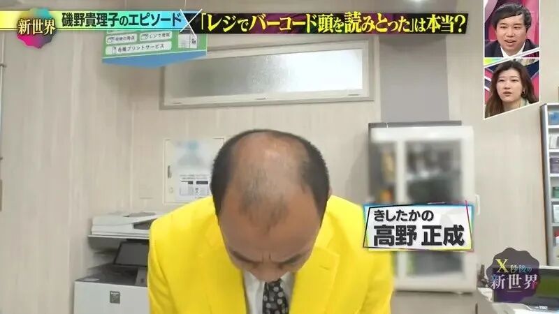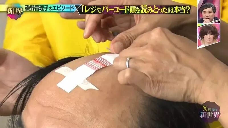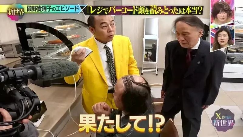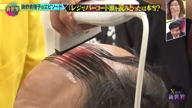 两人几撮稀疏的头发,像条码一样覆盖。主持人高野正成尝试用扫码枪扫扫看两人的头顶,但反复扫描都未能成功。