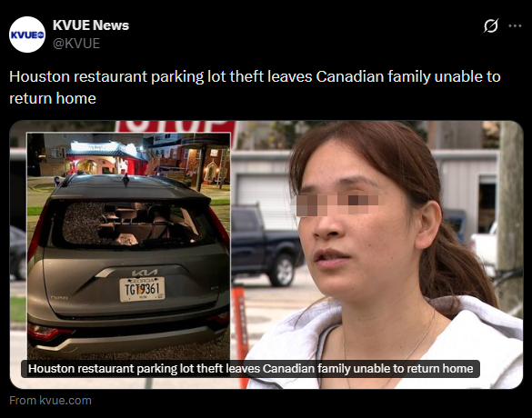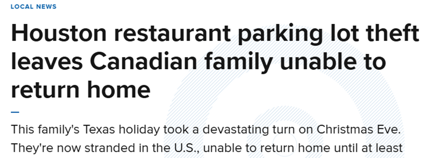 据KHOU 12月29日报道 一个赴美欢度圣诞的加拿大家庭遭遇窃贼洗劫,包括护照在内的几乎所有行李被席卷一空,致使全家滞留异乡,归期难定。谢明初(音译,Mingchu Hsieh)表示,她与家人原计划在美国度过一个欢乐的圣诞假期,沿途游览多座城市。谢女士说:“我们规划从达拉斯入境,经休斯顿前往圣安东尼奥、奥斯汀,游览大弯曲国家公园(Big Bend)后前往新墨西哥州,然后从新墨西哥州飞返加拿大。”