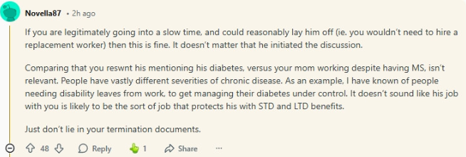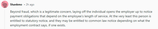 一位网友提醒,雇主在采取任何行动前,应咨询律师或联系省级劳工机构,并指出:“除了欺诈风险,如果你‘裁掉’他,还可能触发法定通知期或解雇补偿金义务,具体取决于工龄和雇佣合同。”