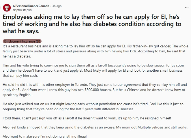 雇主称,员工及其妻子多次试图说服自己签署裁员文件,并表示员工此前在多伦多曾与前雇主“达成过类似协议”,成功通过裁员方式领取EI。发帖者还提到,该员工据称名下拥有两套价值约80万加元的房产,但他是华人,不会说英语。