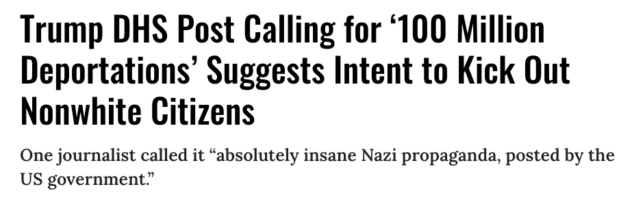 针对国土安全部提出的“驱逐一亿人”说法,《地缘政治经济报告》主编本·诺顿(Ben Norton)指出:“这清楚表明,川普政府的大规模驱逐行动并非针对所谓‘无证移民’。美国境内约有1400万无证移民,但国土安全部却鼓吹驱逐一亿人。这是一种针对少数族裔的清洗号召,其目标是建立一个排除‘第三世界’血统的白人至上主义国家。”