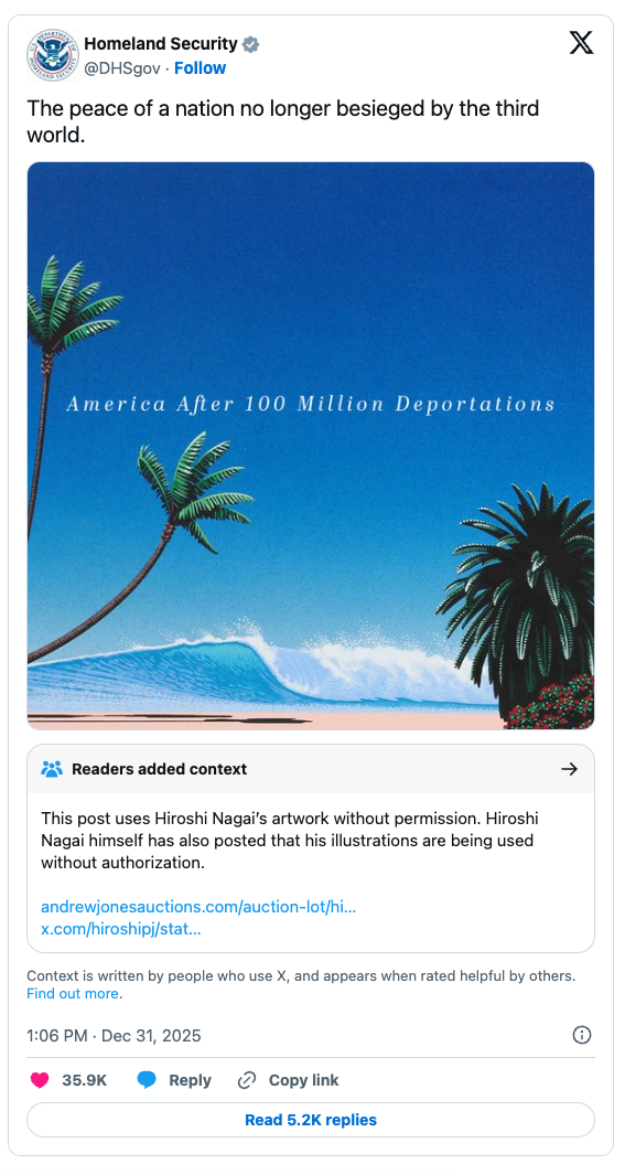 周三,美国国土安全部(Department of Homeland Security,DHS)官方社交媒体账号发布了一幅艺术图片:一辆粉红色的上世纪60年代末凯迪拉克 Eldorado 停靠在阳光明媚的海滩旁,湛蓝的天空下写着“驱逐一亿人后的美国”。