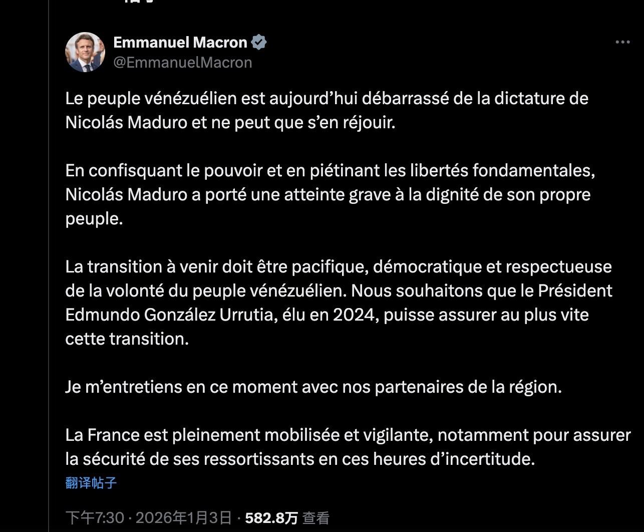 法国外长在社交媒体上写道:“导致马杜罗被捕的军事行动违反了国际法中‘不诉诸武力’的基本原则。法国重申,没有持久的政治解决方案能够从外部强加,只有主权国家人民自己才能决定自己的未来。”