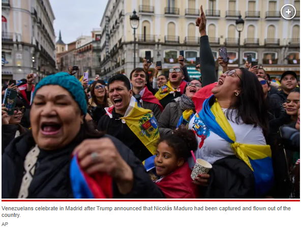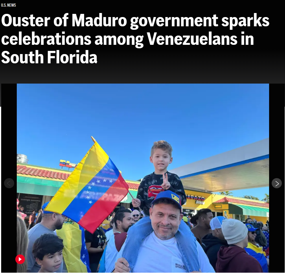 另一名在佛罗里达州多拉尔市(Doral)的庆祝者表示:“今天,正义正在实现。这是为所有离开祖国、向世界证明我们是谁的委内瑞拉人讨回的正义。”