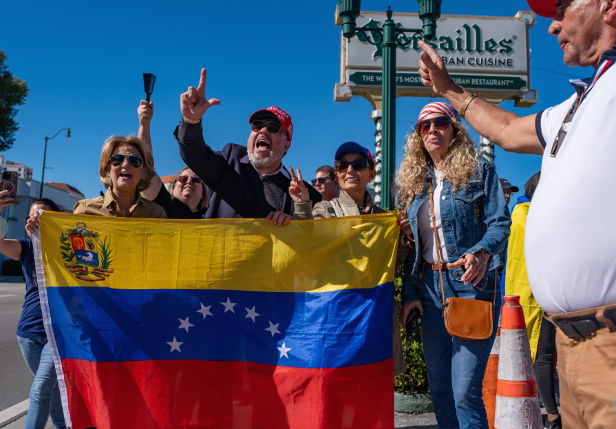 不少人手持美国国旗和委内瑞拉国旗,向下令实施特种部队抓捕行动的美国总统川普表达支持。