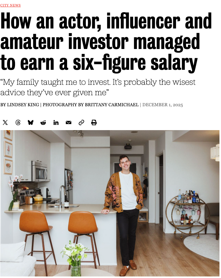 31岁男子 Jordan Shore 租住在多伦多市中心,是一位演员和网红,目前年赚23万加元,每月存2500,计划5年内买房,他最感恩是家人教会他投资。他在渥太华长大,2012年18岁那年,他考进了位于多伦多地区奥克维尔的谢里丹学院(Sheridan),读的音乐剧(musical theatre)专业,之后开启了他的职业生涯。