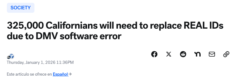 由于加州机动车辆管理局(DMV)系统出现技术错误,约有32.5万名加州居民需要更换其REAL ID。图:新闻标题截图