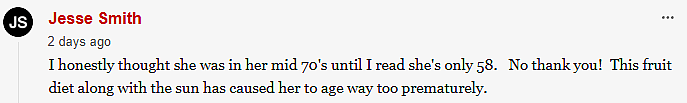 说实话,我以为她已经 70 多岁了,直到我读到她只有 58 岁。不,还是谢谢了,这种水果饮食加上晒太阳让她过早衰老了。