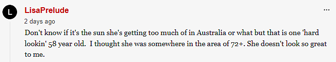 不知道是不是因为在澳大利亚晒太阳太多了,但这是一个“看起来很硬朗”的 58 岁女人。我以为她大概 72岁左右啊,她看起来不太好。