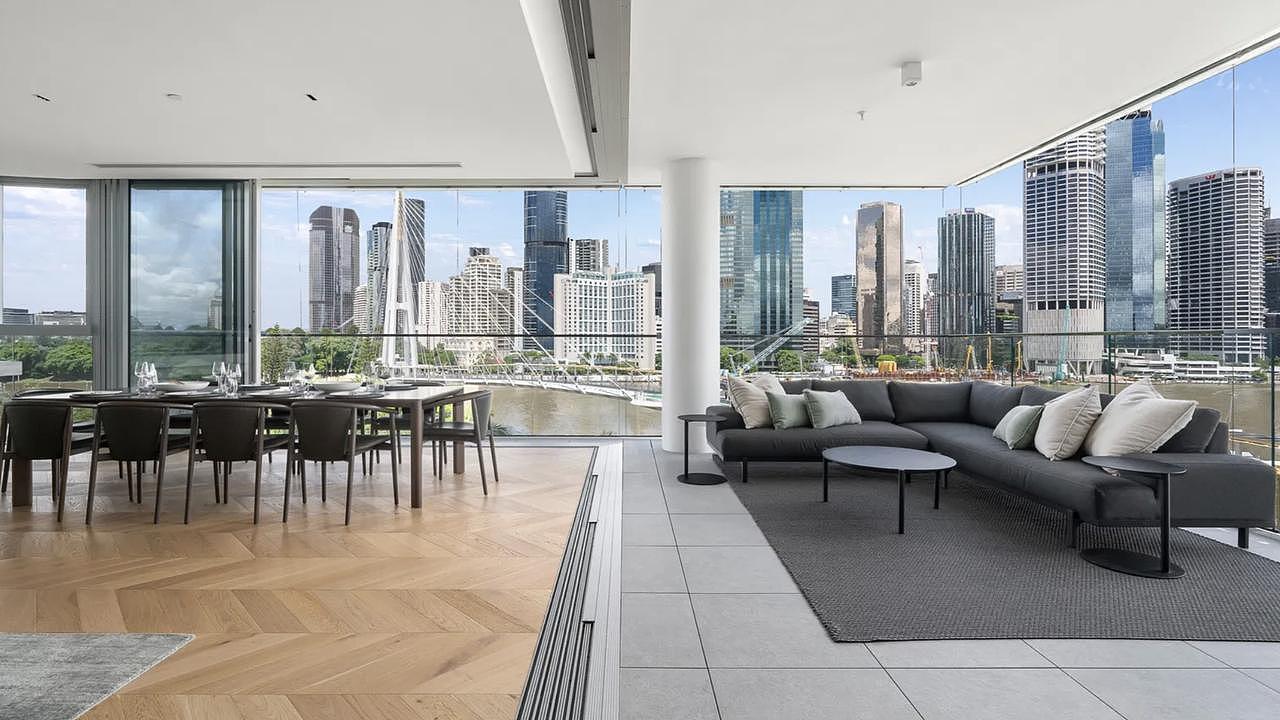 名为 Brisbane Sky Home 的住宅设有一个朝北阳台,配有自动下拉式酒吧 and Vintec 葡萄酒冰箱,该住宅每晚租金1500澳币起。图片:提供/Luxico。