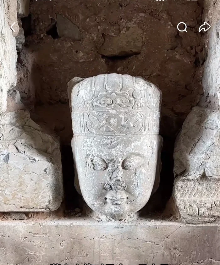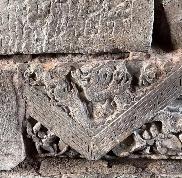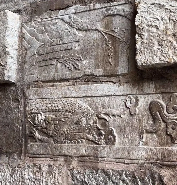 记者注意到,早在2023年,已有网民通过视频指出该桥涵洞内藏有石像生人头,其冠饰为典型的明代六梁冠风格。视频中还可见刻有“万历三十五年”字样的碑文残块及大量龙形浮雕石材,进一步佐证了这些构件的历史年代。