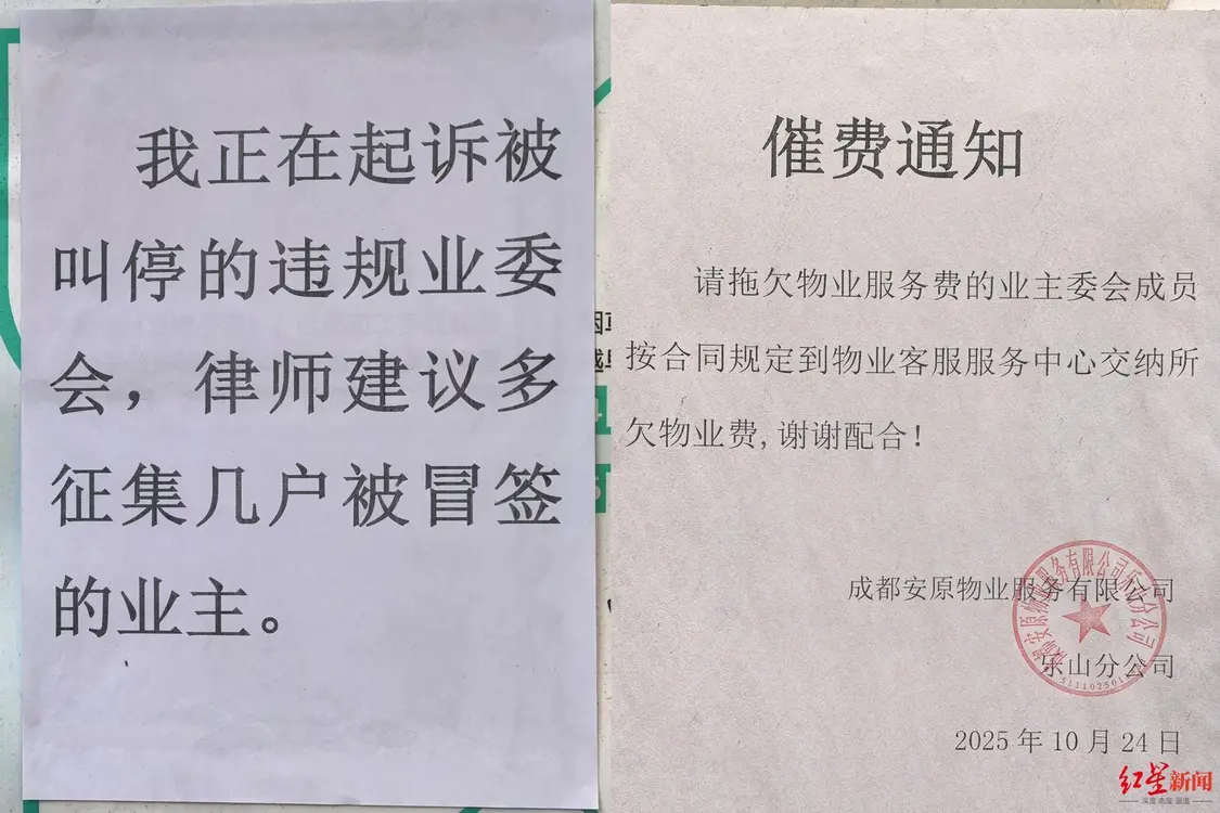 此外,在小区业主群里,也有持不同意见的业主针锋相对;而在线下的小区公示栏上,老物业贴出了针对拖欠物业费的业委会成员的“催费通知”,还有未署名无落款,写有“业委会作假”和“起诉违规业委会”字样的纸张。