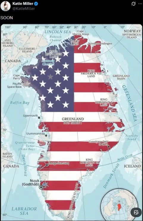 前政府官员、现播客主持人凯蒂·米勒(副幕僚长斯蒂芬·米勒之妻)在X平台发布了一张格陵兰岛的地图,图上以美国国旗颜色涂满全岛,配文仅一个词:“即将”。