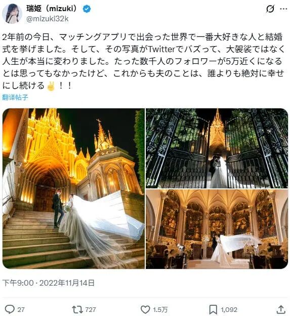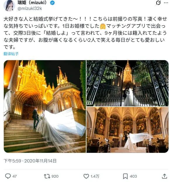 很多新人在举办结婚仪式之前,都会拍摄美美的婚纱照,不但能够见证两人的爱情,也能将两人最美好的时刻记录下来。日本妹子瑞姫(mizuki)曾在2020年11月14日,在社交平台上分享了几张自己跟丈夫拍摄的婚纱照。