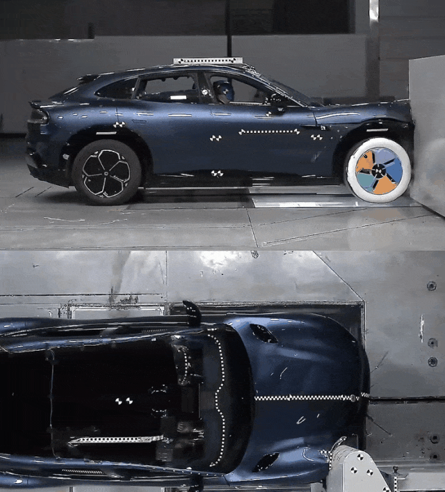 结果就是,YU7 接受了超过国标 1.8 倍速度(90km/h)的 70% 重叠后碰测试,电池与乘员舱都没受损。