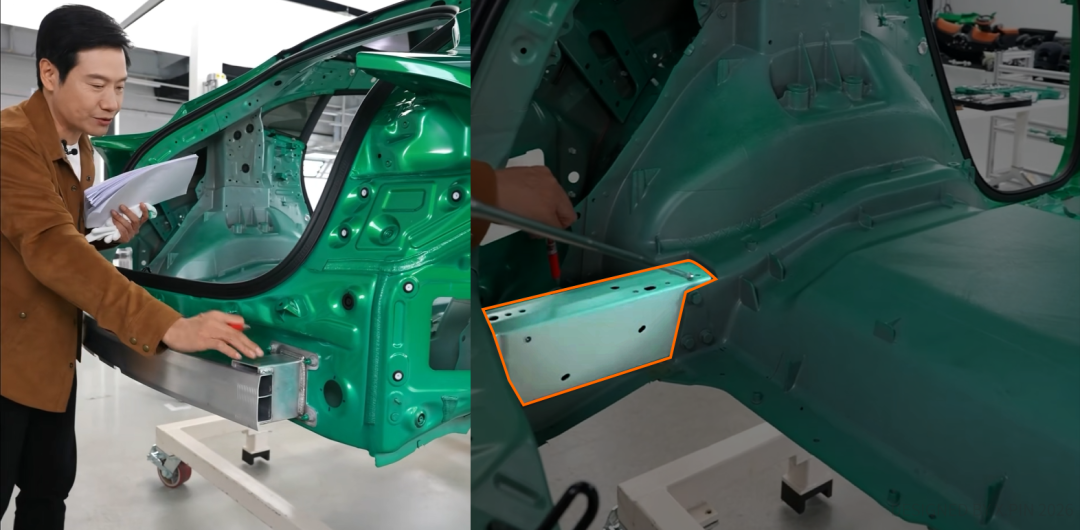 纵梁的后半段,小米则是额外继续通过结构加强,避免乘员舱被侵入。