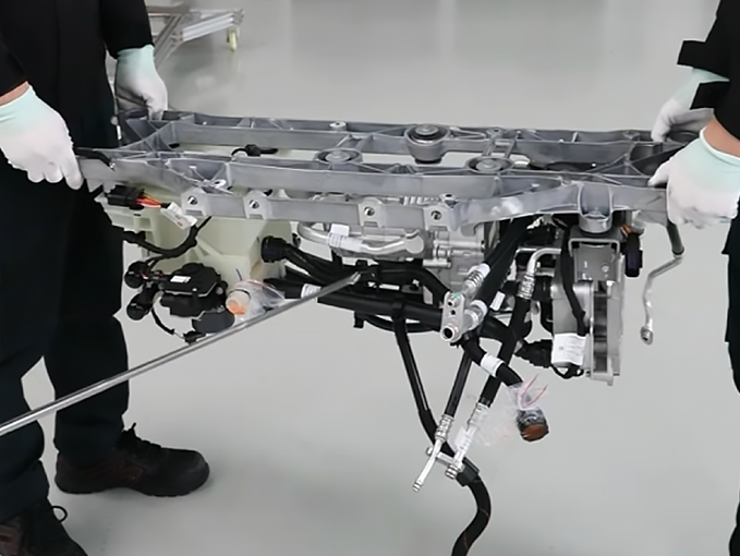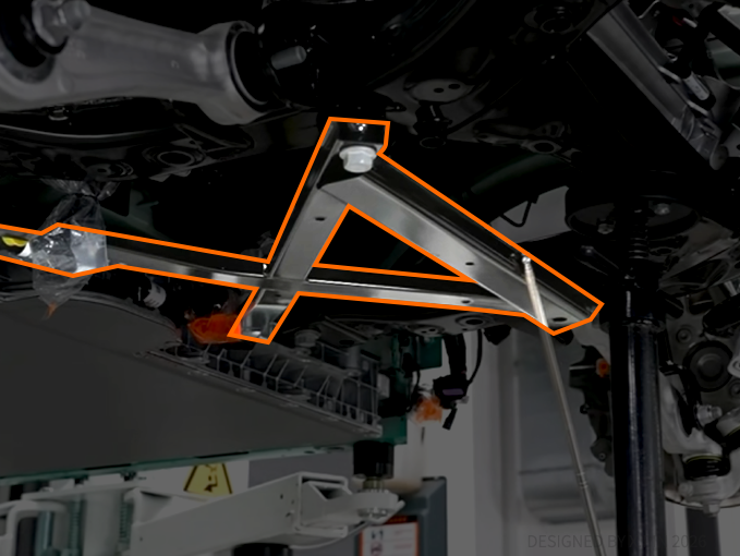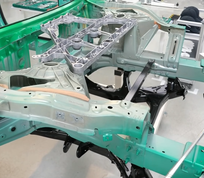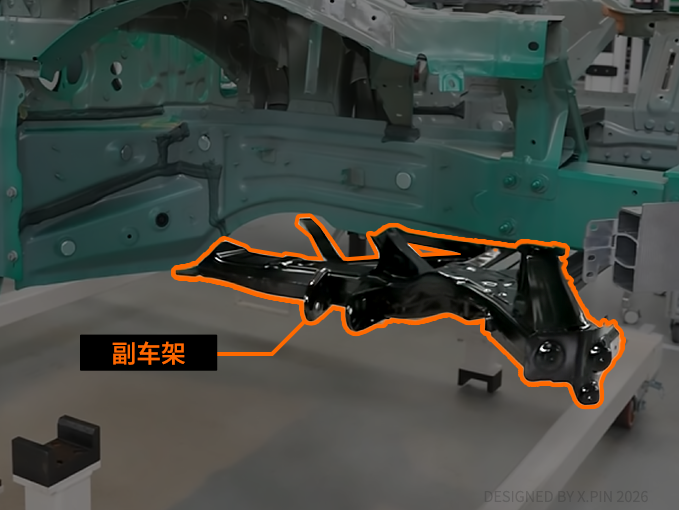 副车架与电池中间,有着一个 “交叉” 形状的压铸横梁,它的高度比电池包低,能替电池包先抵御一波异物冲击。