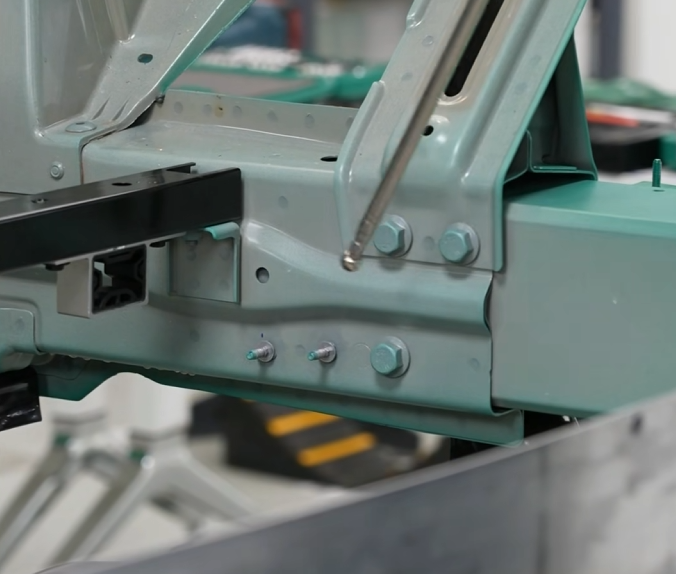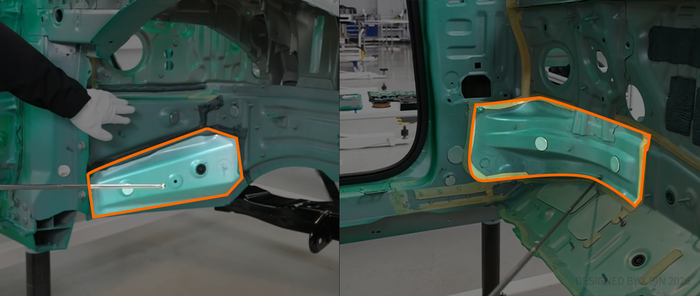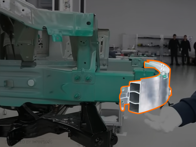 YU7 的纵梁尽可能地利用了长车头的优势,最大化吸能,所以强哥他们在纵梁上内外共做了三道诱导筋,这样纵梁前半部分扛到极限的时候,就会 “对折” 来吸能。