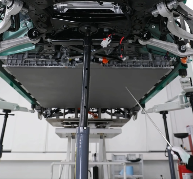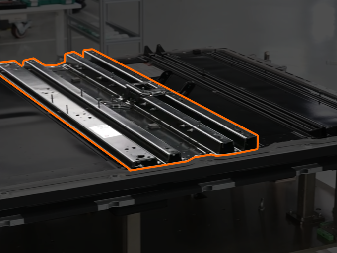 电池则采用 CTB(cell to body)的结构,与车身一同抗压,上面有着 4 条高强度钢,两条 1500MPa,两条 2000MPa。