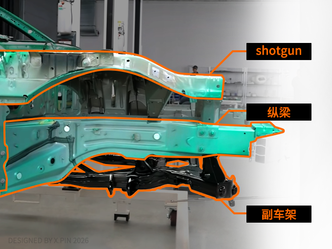 防撞梁和吸能盒扛完之后,力则传到到后方的最主要的 shotgun(形似手枪故此得名)、纵梁与副车架上。