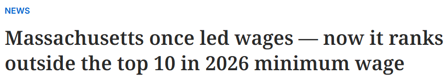 但近来,这一局面已然变化。2026年全美最低工资排名显示,麻州已跌出前十——与此同时,有19个州在新年伊始上调了最低工资标准,另有数个州承诺将在年内晚些时候提高薪资水平。