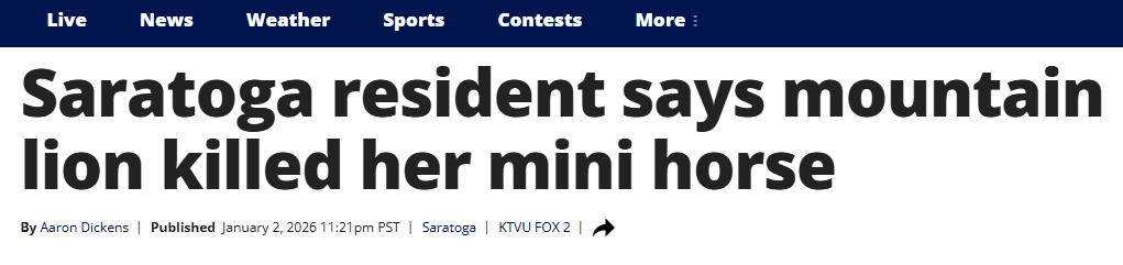 近日,南湾部分地区出现美洲狮出没居民区的情况。一名居民表示,她家的迷你马疑似遭美洲狮袭击致死。(图片来源:KTVU)
