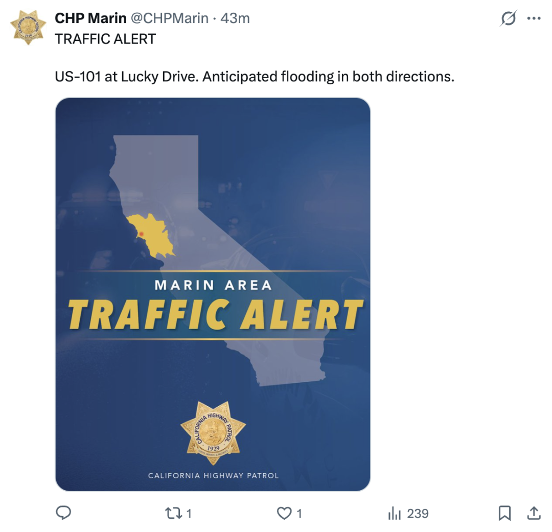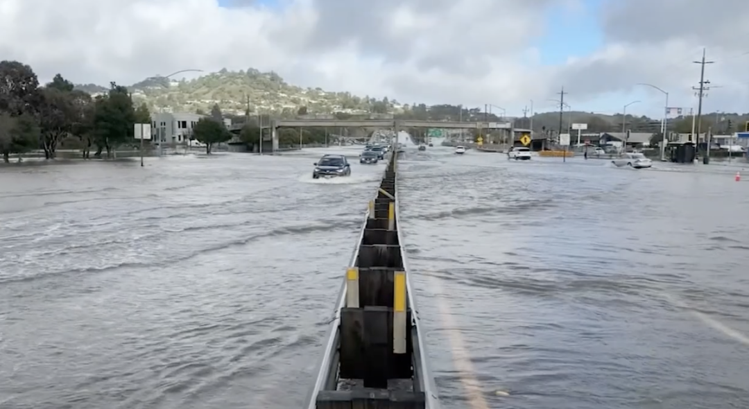 在东湾地区,I-80(奥克兰湾桥段附近)和 I-880多条车道被淹没,执法和交通部门也发布了绕行建议。湾区高速公路局甚至一度关闭了部分收费站附近路段以保障安全。