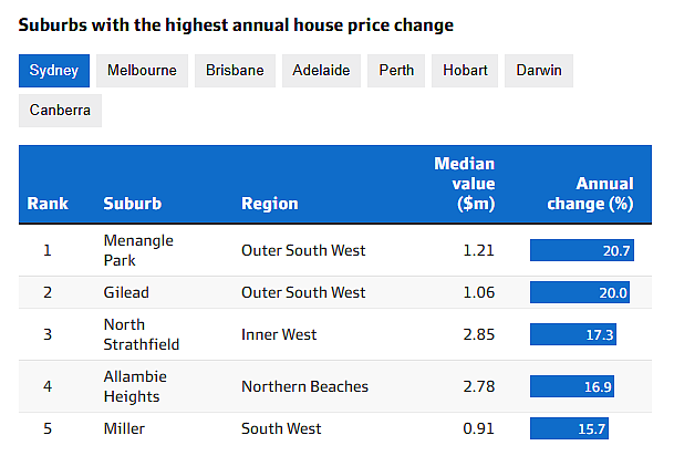 在悉尼,2025年房价涨幅最高的地区是西南部的Menangle Park和Gilead,均上涨20.7%,其次是位于内西边缘的North Strathfield,上涨17.3%。