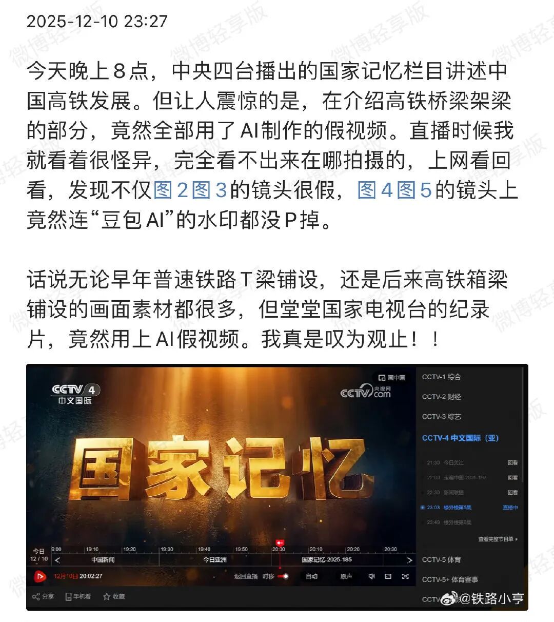 1之前刷到个帖子,提到有部讲述中国高铁发展的纪录片,用了AI生成的画面。这部纪录片是系列节目中的一集,有争议的画面展示了一段架梁作业的过程。
